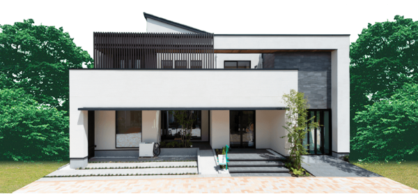 敷地に対し、最大限に空間を活用できるようにしたスキップフロアのある2階建ての住宅です。室内は、ハーフ吹き抜けや、大収納、ロフト等により空間が立体的に活用でき見所が満載です。太陽光やIOT、全館空調等の最新設備を設置した、ZEH住宅。また、日本古来の知恵を多く取り入れ、深い軒先や、土間空間として使うセカンドリビング等新しい住まい方提案も見所の一つです。